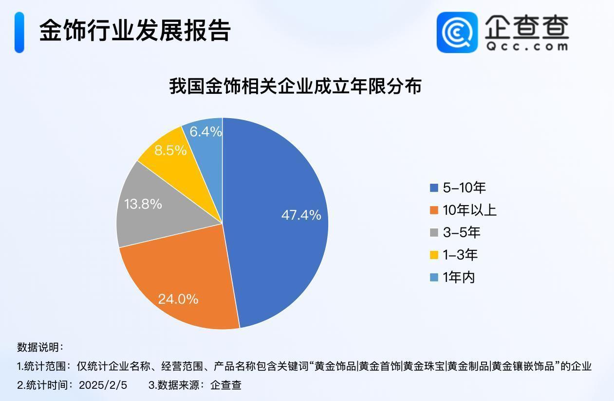 企查查数据显示,我国现存6.6万家金饰相关企业。成立年限上,我国金饰领域以老牌企业为主,超七成金饰相关企业成立5年以上,其中成立5-10年的企业最多,占比47.4%,成立超10年的企业占比24.0%;成立1年内的企业最少,占比6.4%。