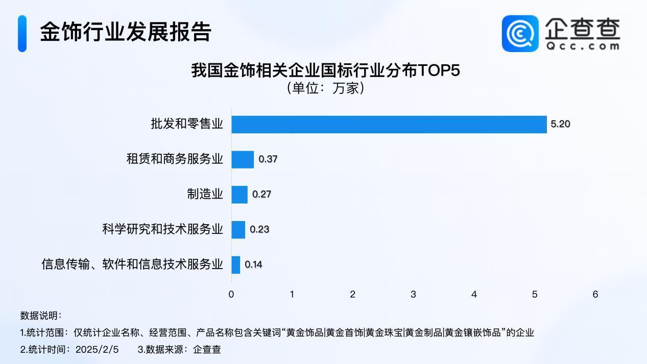 企查查数据显示,行业分布上,我国金饰相关企业主要集中批发和零售业,占比78.7%,另有租赁和商务服务业企业,占比5.6%。(信网记者)