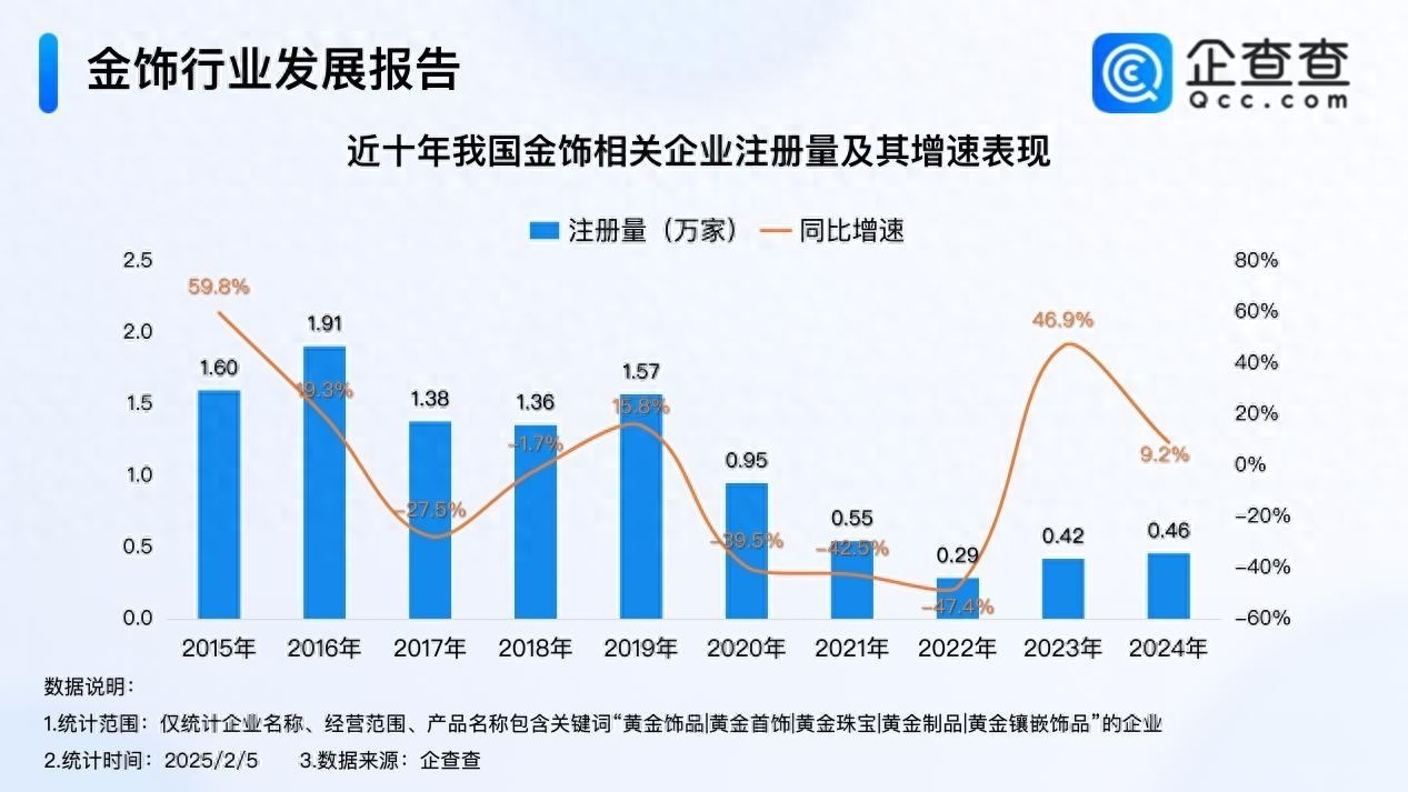 企查查数据显示,近年来在黄金投资与消费双重驱动下,2023年、2024年我国金饰相关企业注册量分别同比增加46.9%、9.2%至0.42万家、0.46万家。